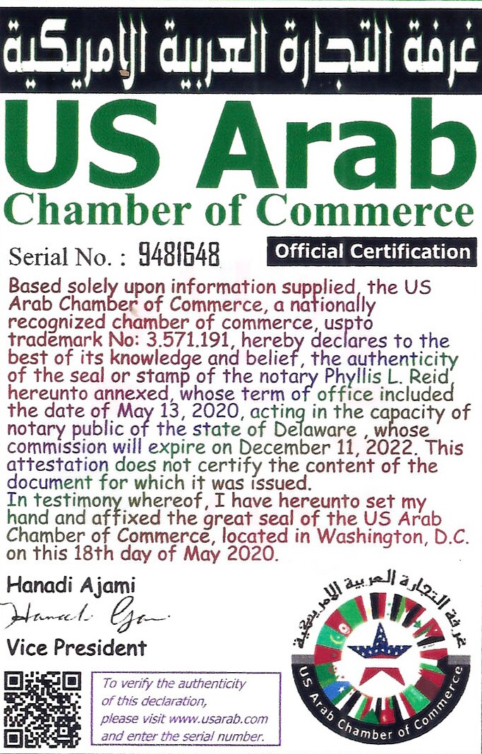 The U.S.-Arab Chamber of Commerce (USACC) will affix its official stamp to the document.