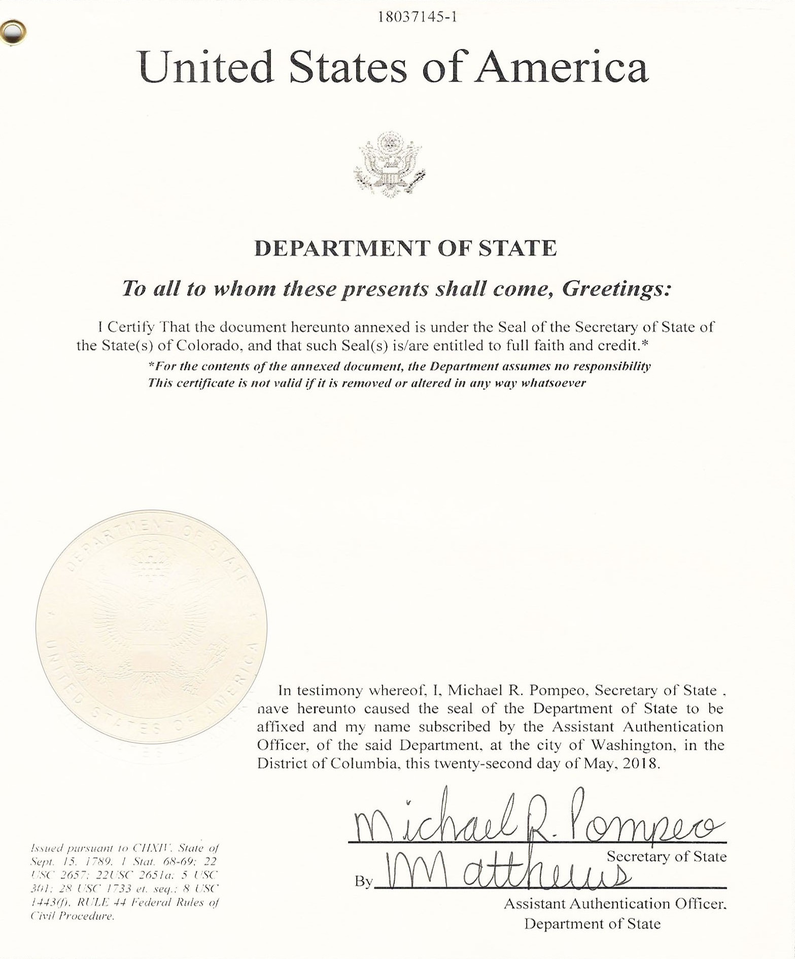 Authenticate the documents with the U.S. Department of State in Washington, D.C.